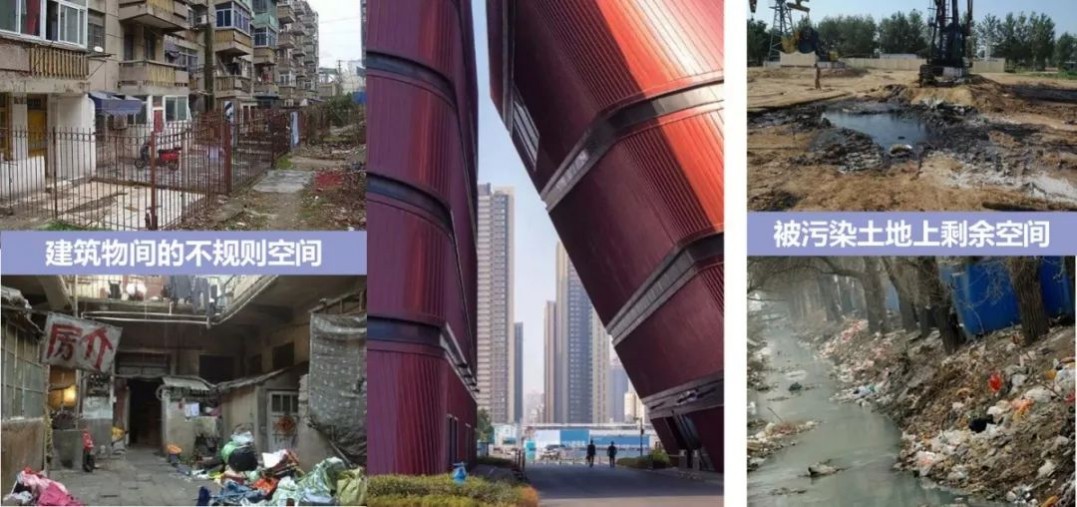 建筑物間的不規(guī)則空間、被污染土地上的剩余空間、高架橋下無(wú)法被利用的剩余空間、地形限制下產(chǎn)生的剩余空間、原有用途改變后被廢棄的空間。